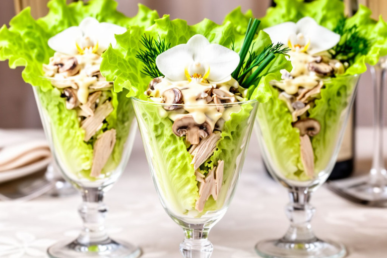 Порционный салат «Орхидея» для женских посиделок: с нежной куриной грудкой, грибами, ни грамма майонеза — вкусно и просто