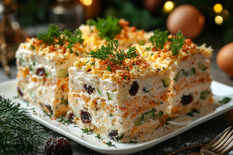 Порционный салат с курицей и черносливом «Сказка»: удобно подавать и накладывать с общего блюда