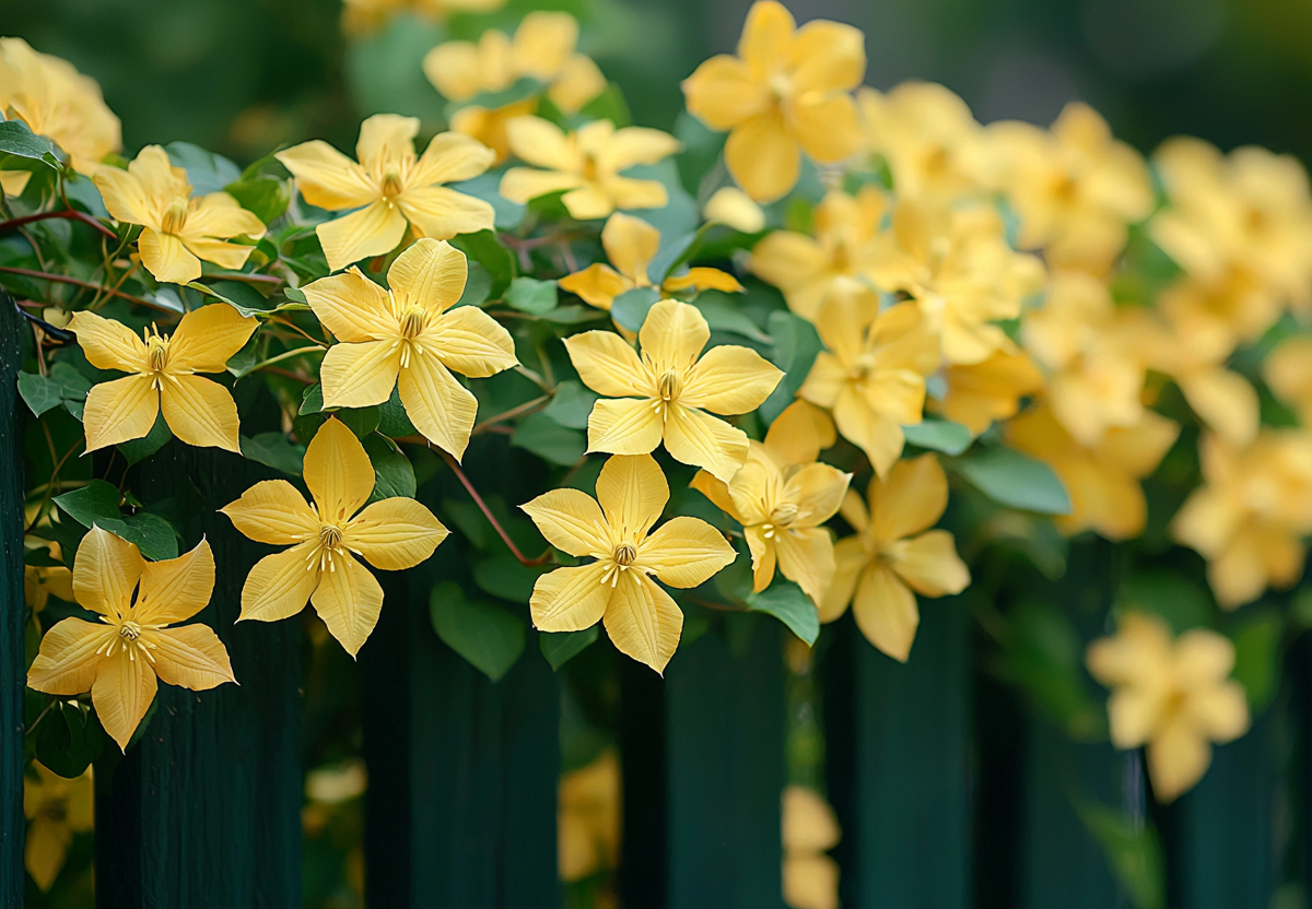 Если вы мечтаете превратить свой забор в живописную цветущую стену, идеальным выбором станет клематис тангутский. Это лиана растет сама десятилетиями, цветет все лето сотнями желтых цветков и не боится жары.