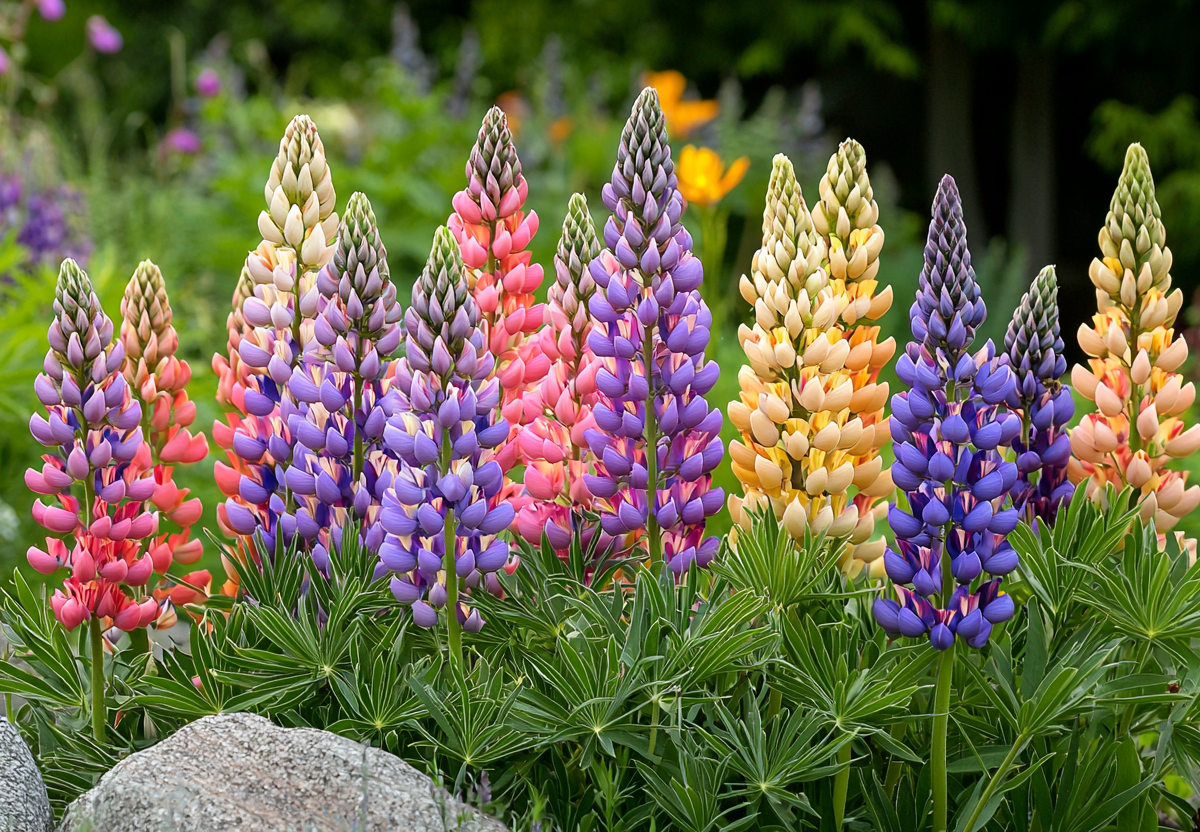 Весной куст начнет активный рост, а в июне выпустит эффектные синие, розовые, белые или двухцветные соцветия, которые будут цвести волнами до сентября. Люпин не требует подкормок (сам обогащает почву азотом), подавляет сорняки и устойчив к болезням.