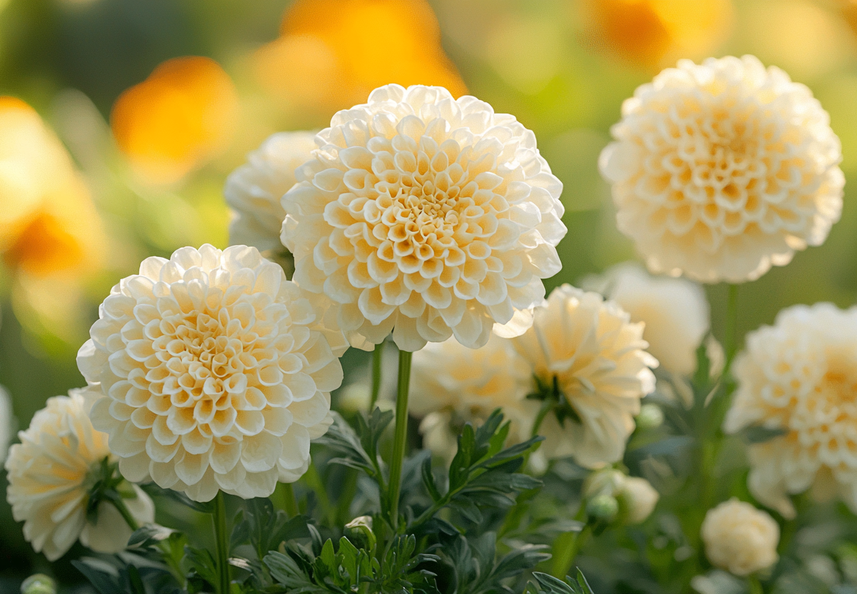 Эти бархатцы полностью меняют представление о привычных нам желто-оранжевых соцветиях. Нежные кремово-белые шары диаметром до 10 см с золотистой сердцевиной выглядят изысканно и благородно, напоминая скорее хризантемы, чем традиционные бархатцы. Их элегантная окраска и идеальная шаровидная форма создают ощущение праздника и легкости в саду. Сорт отличается мощными кустами высотой до 40 см, которые сохраняют компактность и обильно цветут с июня до первых заморозков.