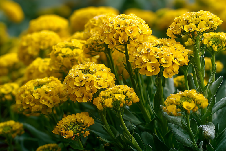 Посадите в апреле — и в июне ваш сад засияет золотом. Алиссум «Золотой самородок» — это многолетник, который образует плотные низкие кустики высотой 15–20 см, сплошь усыпанные мелкими ярко-желтыми цветками с тонким медовым ароматом. В разгар цветения листва почти не видна — перед вами расстилается сплошной золотистый ковер, который привлекает пчел и бабочек.
