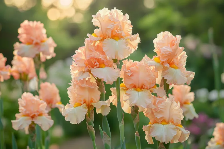 Ирис «джун роуз» — это воплощение нежного летнего рассвета в вашем саду. Его крупные, изысканные цветы, окрашенные в теплые персиково-розовые и медовые оттенки, действительно кажутся светящимися изнутри. Этот сорт привносит в цветник удивительное ощущение тепла, уюта и безмятежности, идеально вписываясь как в романтичные композиции в пастельных тонах, так и становясь ярким акцентом среди сочной зелени.