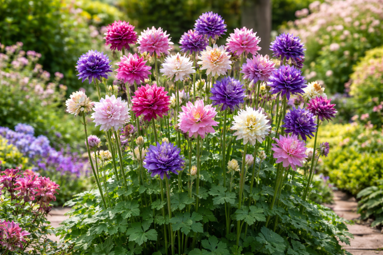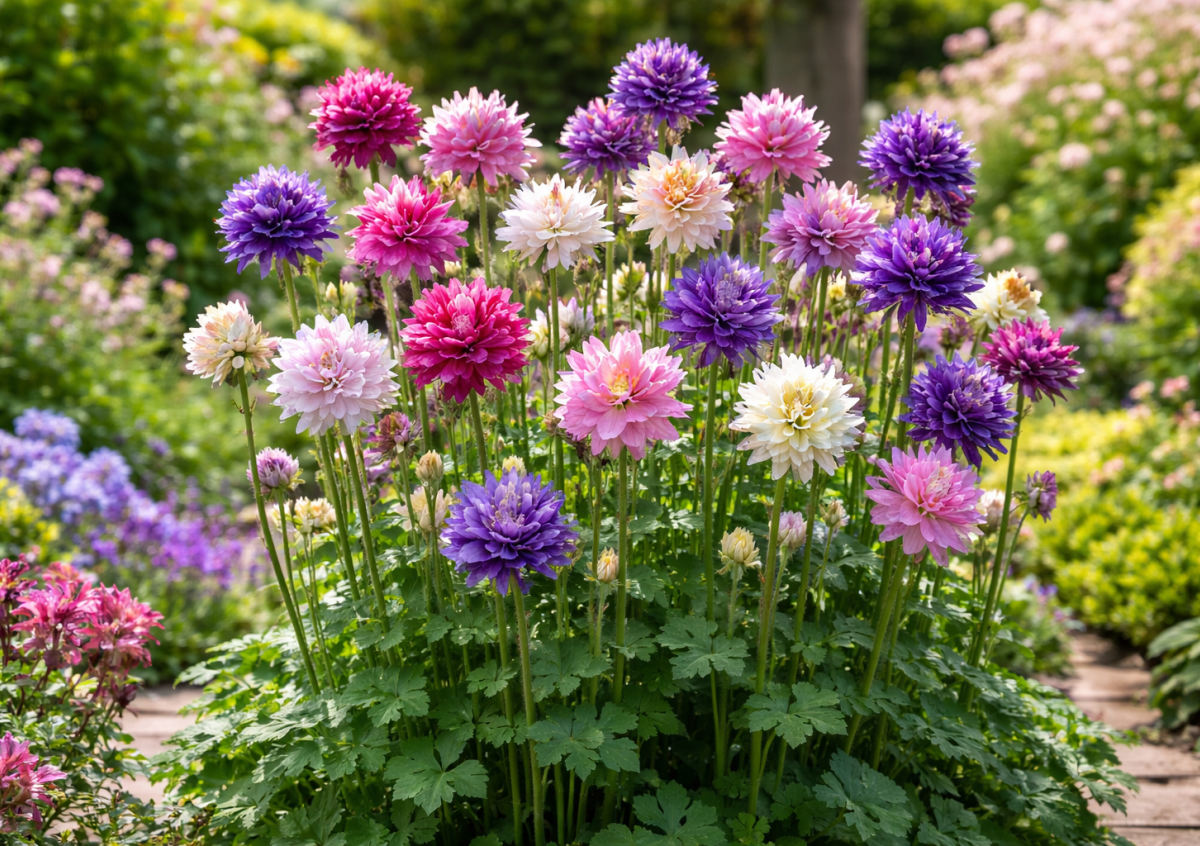 Садоводы всё чаще выбирают цветы, которые не требуют постоянного ухода, но при этом выглядят эффектно. Аквилегия «Башня» — именно такая находка. Этот многолетник способен превратить обычный палисадник в романтичный уголок с нотками старинного сада. Высокий аккуратный куст с декоративной ажурной листвой выпускает прочные цветоносы, на которых раскрываются плотные махровые цветки с короткой шпорой. Они смотрят вверх и не поникают даже после дождя. Цветение обильное и продолжительное — в первой половине лета клумба буквально утопает в ярких красках.
