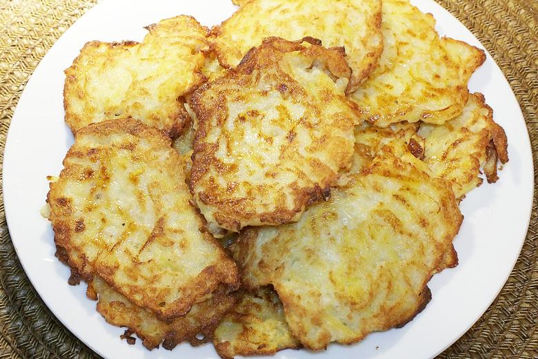 Очищенные картофелины (около 500 г) натрите на терке мелко, слегка отожмите сок. Добавьте к ним 1 тертую луковицу, 2-3 ст. л. муки, чуть-чуть перца, соли, любимых приправ. Массу осталось как следует вымешать. Осторожно выкладывайте ее ложкой на разогретую сковороду с капелькой подсолнечного (или другого растительного) масла.