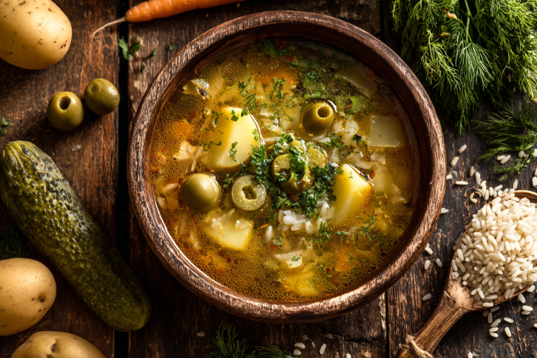 Картофель отварите в части воды до мягкости и разомните прямо в отваре — именно это делает бульон густым и бархатистым. Добавьте остальную воду, доведите до кипения и всыпьте промытый рис. Лук мелко нарежьте, морковь натрите, огурцы нарежьте кубиками и отправьте в кастрюлю. В конце добавьте оливки, травы, соль и перец. Готовый суп посыпьте зеленью и дайте настояться под крышкой 15 минут. Рассольник получается ароматным, насыщенным и отлично насыщает без лишней тяжести.
