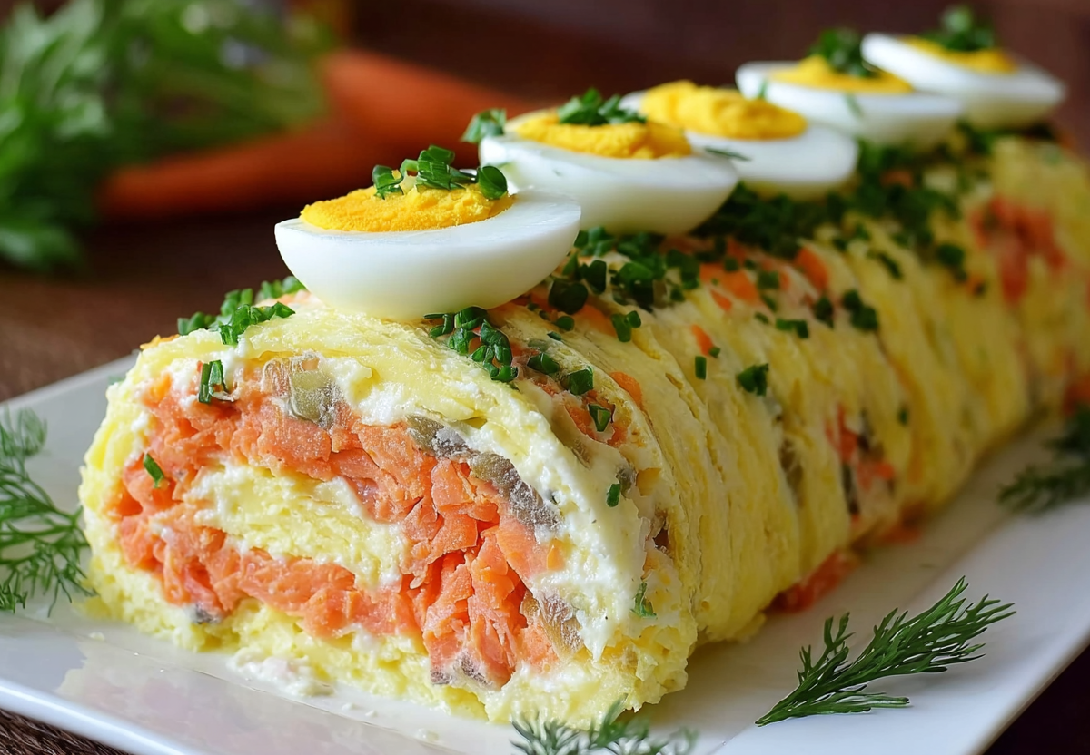 Для основы возьмите 4 отварные картофелины, 3 моркови, 300 г отварного филе горбуши или сайры, 4 яйца и пучок зеленого лука. Картофель и морковь натрите на мелкой терке. Рыбу разомните вилкой, яичные белки и желтки натрите отдельно. Расстелите на столе пищевую пленку. Выложите первый слой из картофеля, слегка его уплотните. Сбрызните соусом из 150 г греческого йогурта, чайной ложки дижонской горчицы и сока лимона. Далее слоями идет рыба, затем морковь, белки и зеленый лук. Аккуратно, приподнимая пленку, сверните все в тугой рулет. Уберите в холод на 2 часа. Перед подачей украсьте желтками и зеленью — ваш праздничный шедевр готов!