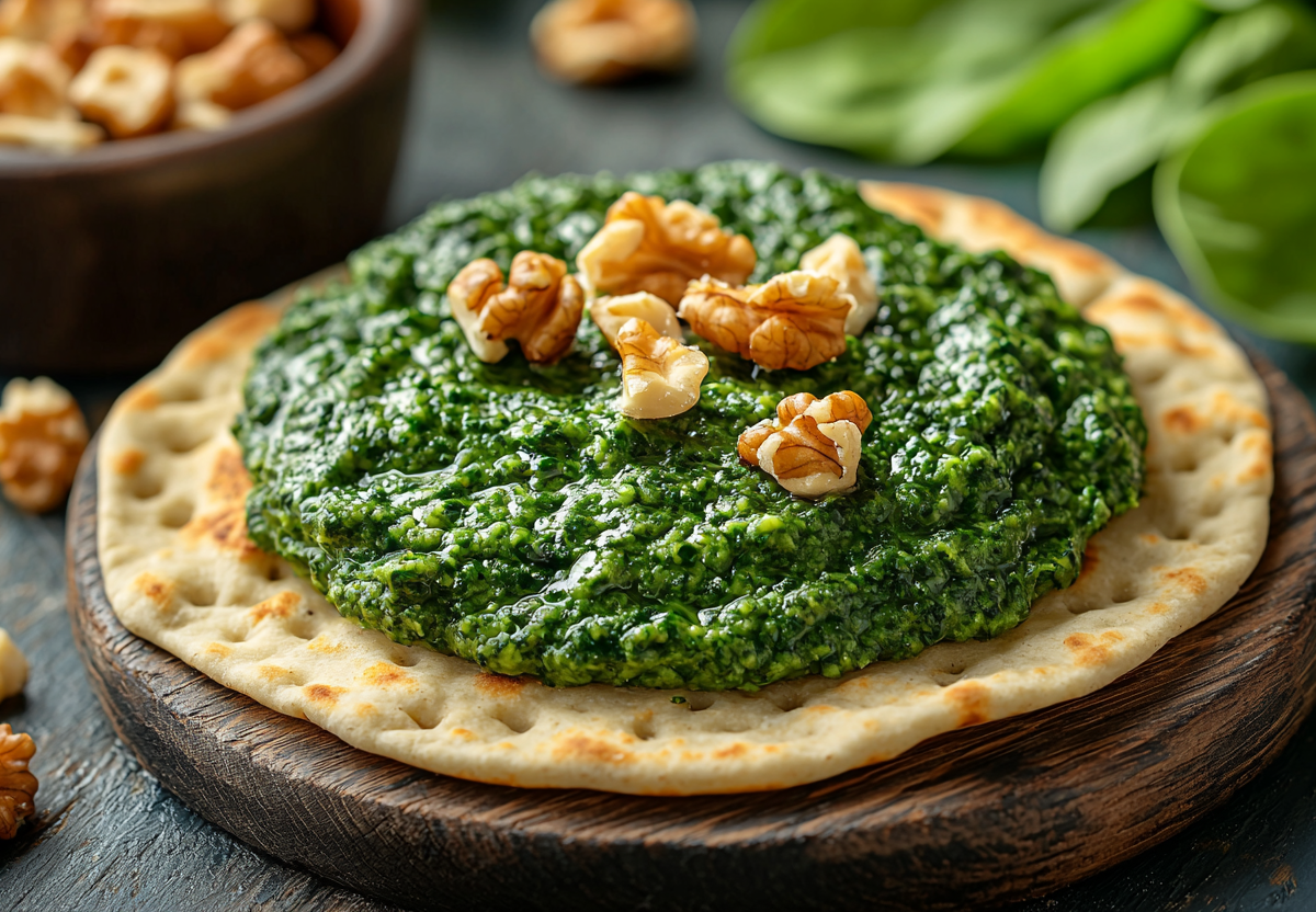 Возьмите большую миску свежего шпината (примерно 300 г), тщательно промойте и ошпарьте кипятком или бланшируйте 2–3 минуты в подсоленной воде. Откиньте на дуршлаг, слегка отожмите и крупно нарежьте. Горсть грецких орехов (50–70 г) измельчите в ступке или блендере до состояния мелкой крошки, добавьте 1 пучок рубленой кинзы, 2–3 ч. л. хмели-сунели и 1–2 ст. л. винного уксуса. Тщательно разотрите в пасту. Если смесь слишком густая, добавьте пару ложек остывшего отвара от шпината или кипяченой воды.