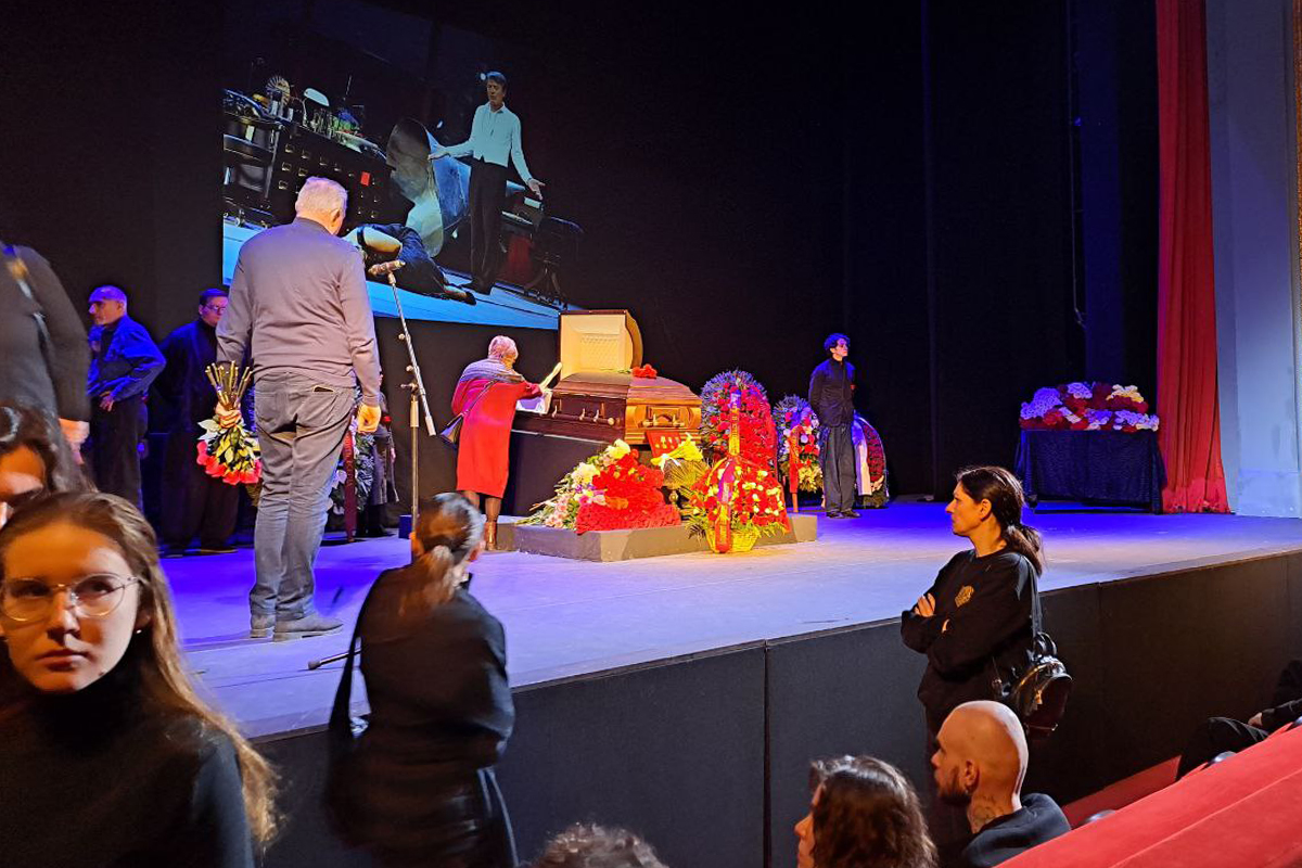 На сцене театра стоит гроб в окружении венков и живых цветов, буквально утопая в них. На экране позади сцены меняются кадры с актером в разных ролях в постановках театра. Гражданская панихида закончилась в 11:00 по московскому времени.