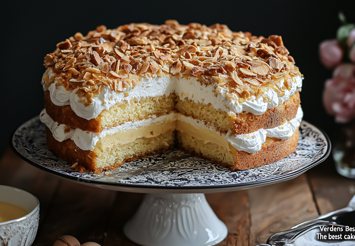 Для торта вам понадобится: для теста — 150 г сливочного масла, 150 г сахара, 3 яйца (желтки отдельно от белков), 175 г муки, 2 ч. л. разрыхлителя, 100 мл молока, 1 ч. л. ванильного экстракта; для меренги — 3 белка, 150 г сахара, 150 г измельченного миндаля. Разотрите мягкое масло с сахаром, добавьте желтки, ваниль, муку с разрыхлителем и молоко. Белки взбейте в крутую пену с сахаром, аккуратно вмешайте миндаль. В форму выложите тесто, сверху равномерно распределите меренгу. Выпекайте при 175 °C 30–35 минут до золотистой меренги. Полностью остудите. Для заварного крема: 500 мл молока, 3 желтка, 100 г сахара, 40 г кукурузного крахмала, 200 г мягкого сливочного масла, ваниль. Желтки, сахар и крахмал взбейте, влейте горячее молоко. Варите на малом огне до загустения, остудите. Взбейте масло и вмешайте в остывший крем. Разрежьте остывший корж горизонтально. Нижнюю часть смажьте половиной крема, накройте верхней частью (меренгой вверх). Бока торта обильно покройте оставшимся кремом. Дайте торту пропитаться в холодильнике 4–6 часов.