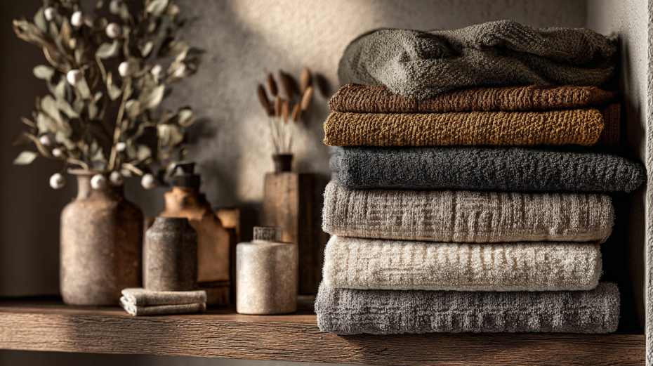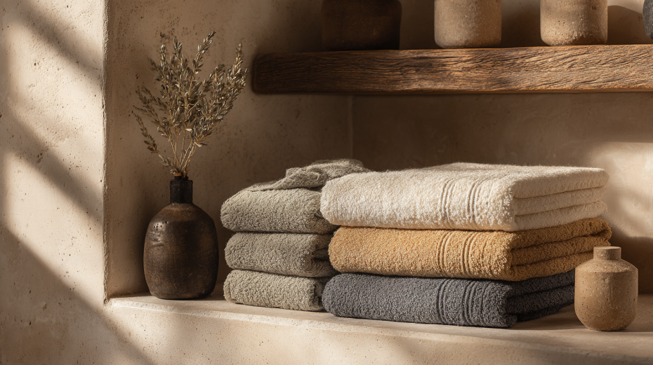 Полотенца давно стали частью домашнего декора. Гармоничные оттенки создают ощущение уюта в ванной. В тренде — натуральные тона: песочный, оливковый, серый, бежевый, молочный. Яркие акценты можно использовать как декоративный элемент, особенно если полотенца сложены на открытых полках.