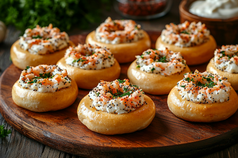Для приготовления вам понадобится: 200 г крупных сушек, 200 г крабовых палочек, 2 плавленых сырка, 3 ст. л. майонеза, 2 зубчика чеснока, 100 мл молока, зелень для украшения. Сушки замочите в молоке на 3–5 минут до мягкости. Для намазки измельчите крабовые палочки, натрите сырки, смешайте с майонезом и измельченным чесноком. На каждую размягченную сушку выложите столовую ложку крабовой намазки, сформируйте горку. Выложите закуску на противень и запекайте 10–12 минут при 180 °C до легкой румяности.
