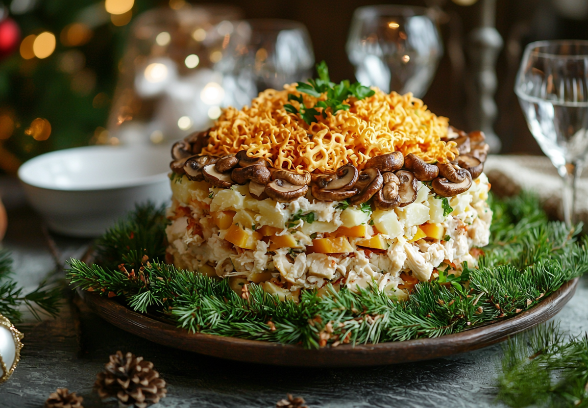 Этот праздничный рецепт слоеного салата без кучи продуктов отлично подойдет для занятых хозяек и тех, кто устал от сложных блюд. Для его приготовления нужны курица, грибы, сыр, яйца и капелька майонеза.