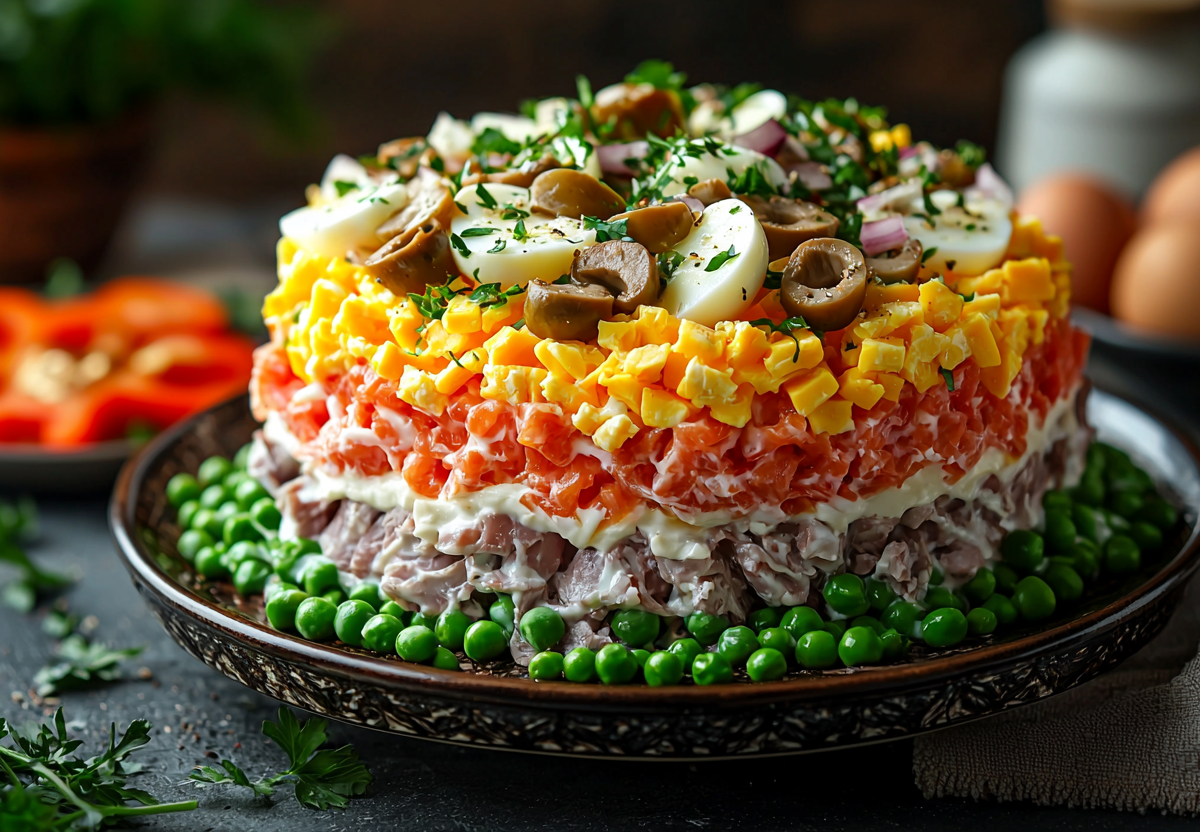 - Собираем салат слоями: язык → майонезная сетка, маринованный лук → майонез, грибы → майонез, яйца → майонез, сыр → майонез, зеленый горошек. Украсьте оливками и полосками болгарского перца. Дайте салату пропитаться в холодильнике 2–3 часа. Приятного аппетита!