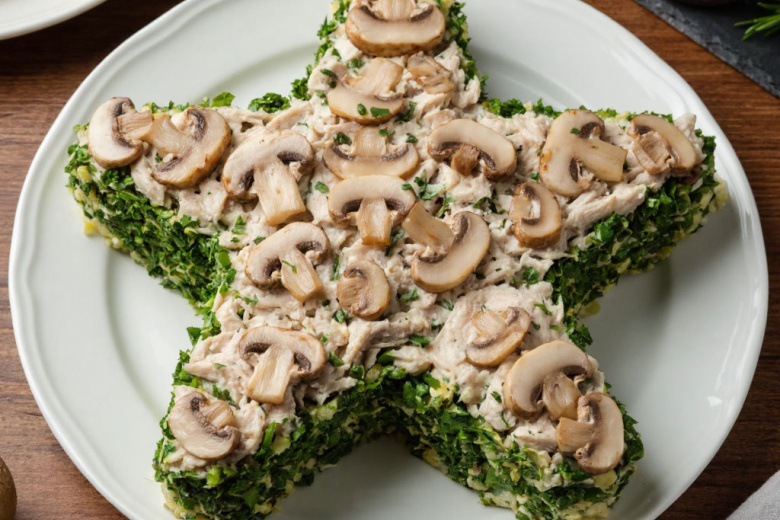 Праздничный салат «Танкист» с курицей и грибами: выкладываю в форме звезды — и закуска, и украшение мужского стола