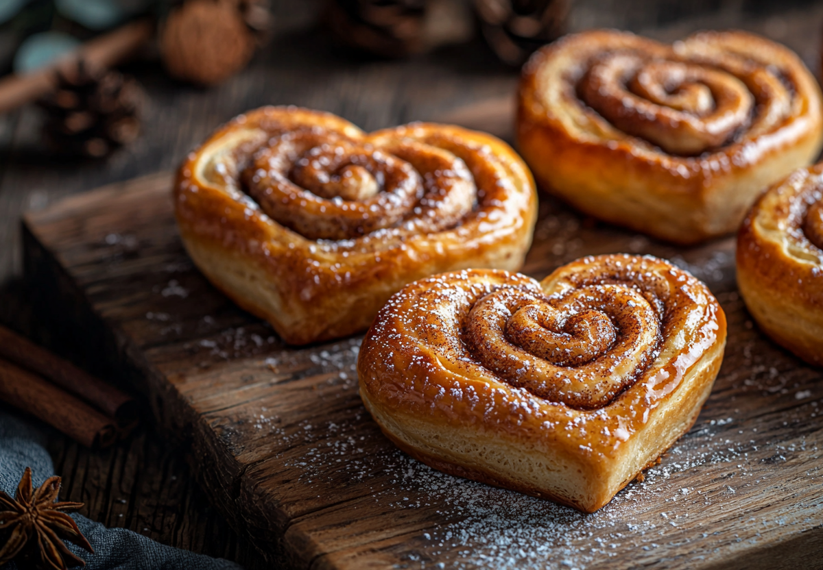 Подошедшее тесто делю на кусочки по 60–80 г, каждый раскатываю в овал, смазываю подсолнечным маслом и посыпаю смесью из 4 ст. л. сахара и 1,5 ч. л. корицы. Сворачиваю каждый овал в плотный рулетик, сгибаю пополам и делаю надрез посередине, не доходя до конца, затем раскрываю — получается сердечко. Выкладываю булочки на противень, смазываю желтком и выпекаю в разогретой до 180 °C духовке около 20 минут до золотистого цвета.