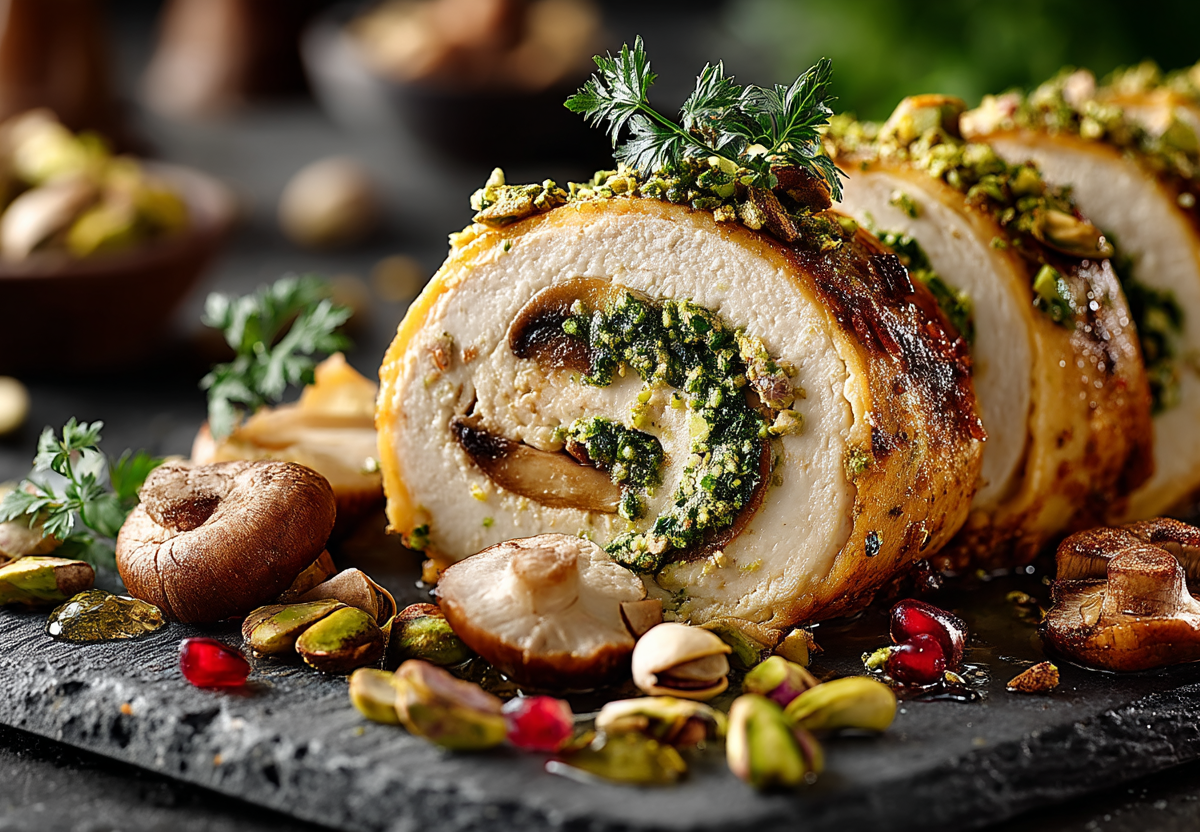 Превращаю курицу в изысканный рулет — с грибной начинкой и фисташками для хруста и праздничного вида