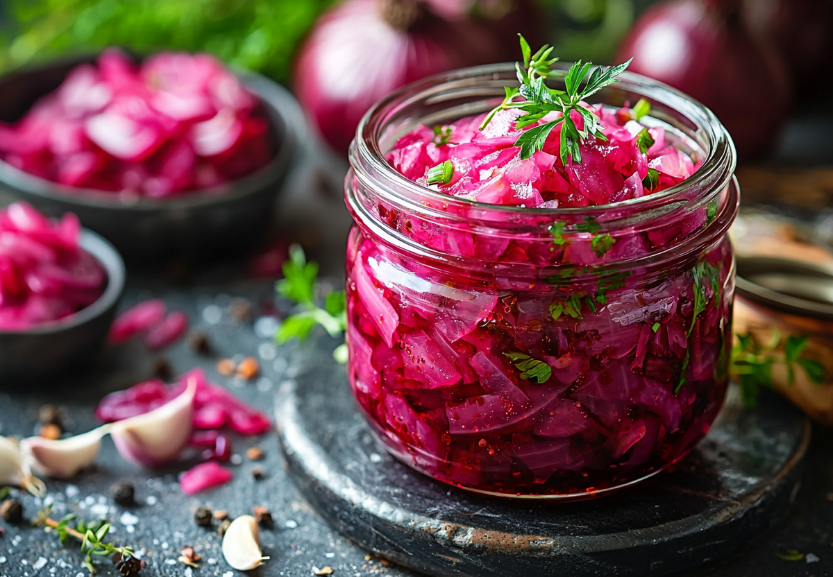 Этот рецепт кардинально меняет лук! После маринования он теряет всю свою резкость и горечь, но сохраняет приятную остроту и хрусткость. Свекла придает ему красивый розовый оттенок и легкую сладость.