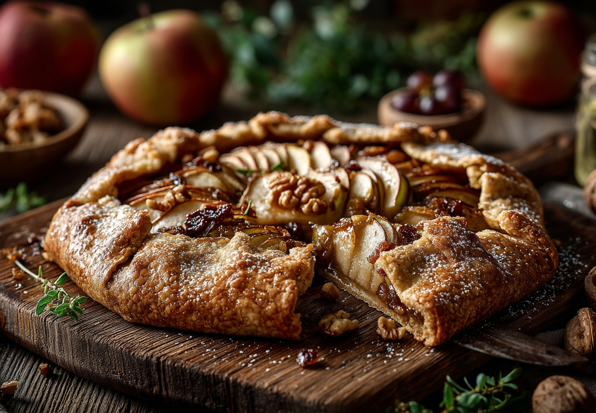 Готовлю так: беру муку (330 г) и натираю в нее на крупной терке замороженное сливочное масло (170 г). Быстро вливаю ледяную воду (150 мл, можно с ложкой лимонного сока) и собираю тесто силиконовым шпателем, не разминая руками. Формирую шар, заворачиваю в пленку и убираю в холодильник на отдых. Пока тесто охлаждается, режу яблоки (1 кг) тонкими слайсами, смешиваю их с изюмом и грецкими орехами (около 100 г), сахаром и корицей по вкусу, добавляю столовую ложку крахмала, чтобы начинка не растекалась. Раскатываю охлажденное тесто, перекладываю на пергамент, выкладываю начинку горкой и защипываю свободные края, как у галеты. Смазываю пирог взбитым яйцом для румяной корочки и отправляю в разогретую до 180°C духовку на 40 минут. Подаю остывшим — к чаю после хорошего ужина.