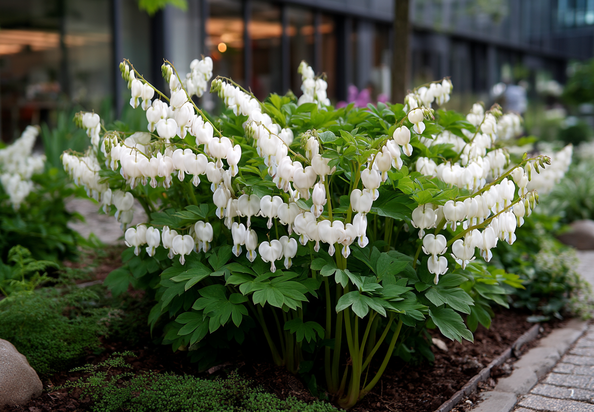 На фоне ажурной, нежной листвы в конце весны распускаются удивительные цветы, по форме напоминающие маленькие сердечки, словно пронзенные стрелой. Они могут быть розовыми, белыми или красными, изящно свисая с дугообразных стеблей. Дицентра обожает прохладу и влажность, под кронами деревьев или у северной стороны дома она чувствует себя великолепно, цветет долго и обильно.