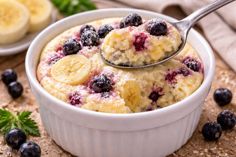 Творог обезжиренный — 150 г, банан — 1 шт., яйцо — 1 шт., манная крупа — 2 ст. л., ягоды (например, чёрная смородина) — 2 ст. л., подсластитель — по вкусу.