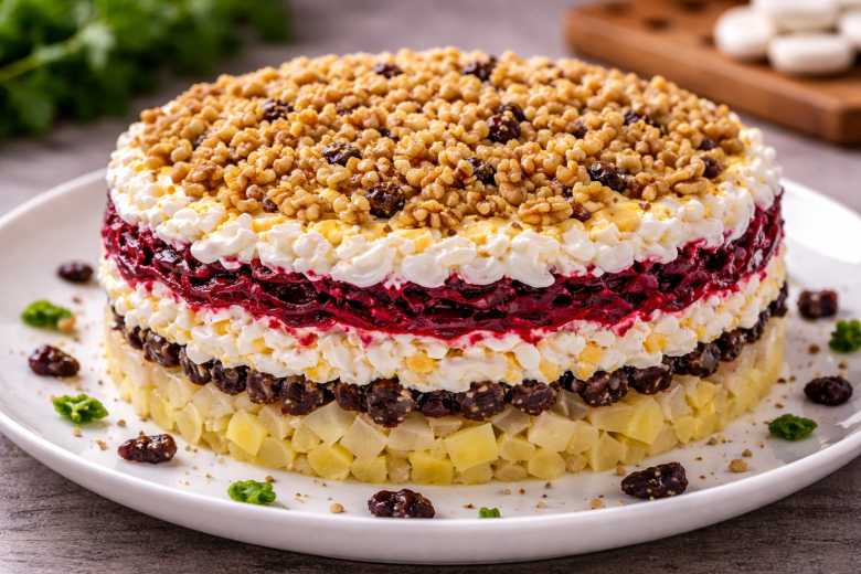 Он сочетает в себе простоту и насыщенный вкус: сладковатая свекла, нежный картофель, пикантный чернослив и орехи создают ту самую гармонию, за которую этот салат любят снова и снова. А легкая чесночная нотка делает вкус еще ярче и интереснее.