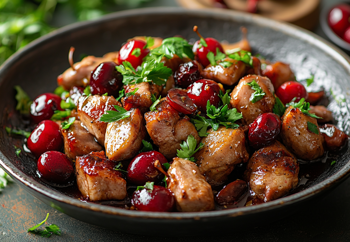 Свинина с черешней — необычное и ароматное блюдо, которое объединяет сочное мясо и сладкие ягоды. Такое сочетание придает мясу свежесть и легкую фруктовую кислинку. Это отличная идея для разнообразия повседневного меню или праздничного стола.