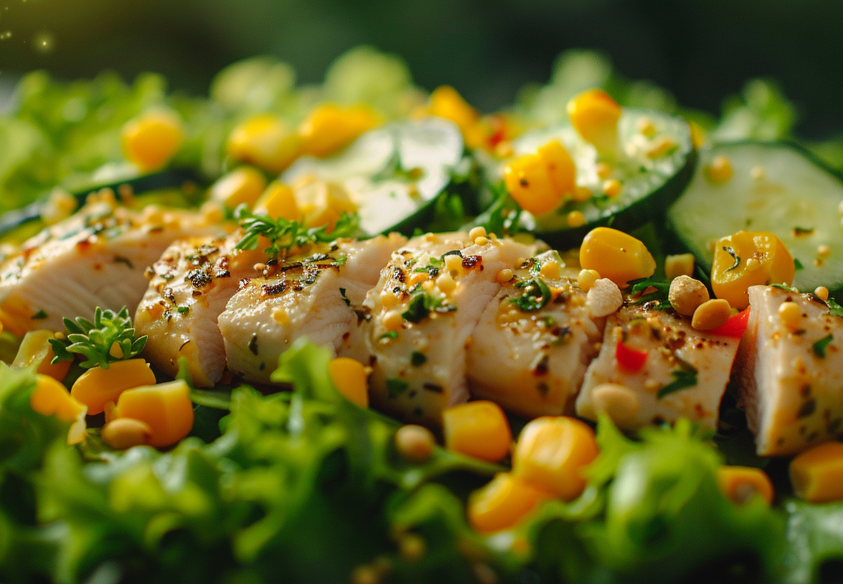 Белое мясо нарезать крупным кубиком, зелень порубить ножом, салат нарезать соломкой. Из кукурузы слить маринад. Огурцы нашинковать кружками. Для заправки смешать майонез с горчицей и солью. Все составляющие салата соединить в миске и перемешать. При подаче на стол можно украсить ломтиками вареного яйца и листиками свежей петрушки.