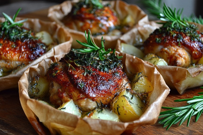Это гениально простое и очень вкусное блюдо, идеальное для семейного ужина или праздничного стола, когда хочется удивить гостей красивой подачей без лишних хлопот. Получается обалденная вкуснятина: нежная курица с золотистой корочкой, мягкая картошечка, пропитанная мясным соком и ароматом чеснока и розмарина, а главное — каждая порция в собственной лодочке из пергамента, которая сохраняет все соки внутри.