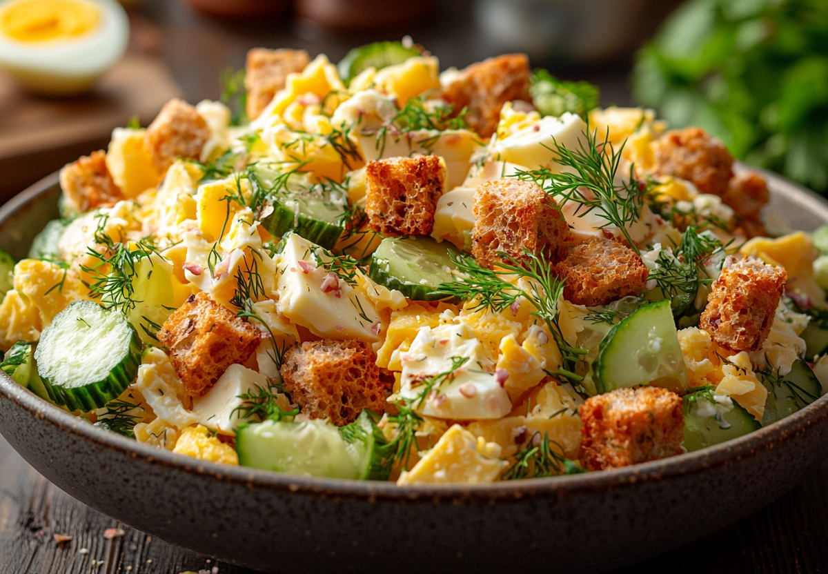 2. Сборка: в миске смешайте сыр, огурцы, яйца и укроп. Добавьте сухарики и пропущенный через пресс чеснок. При желании слегка поперчите.
