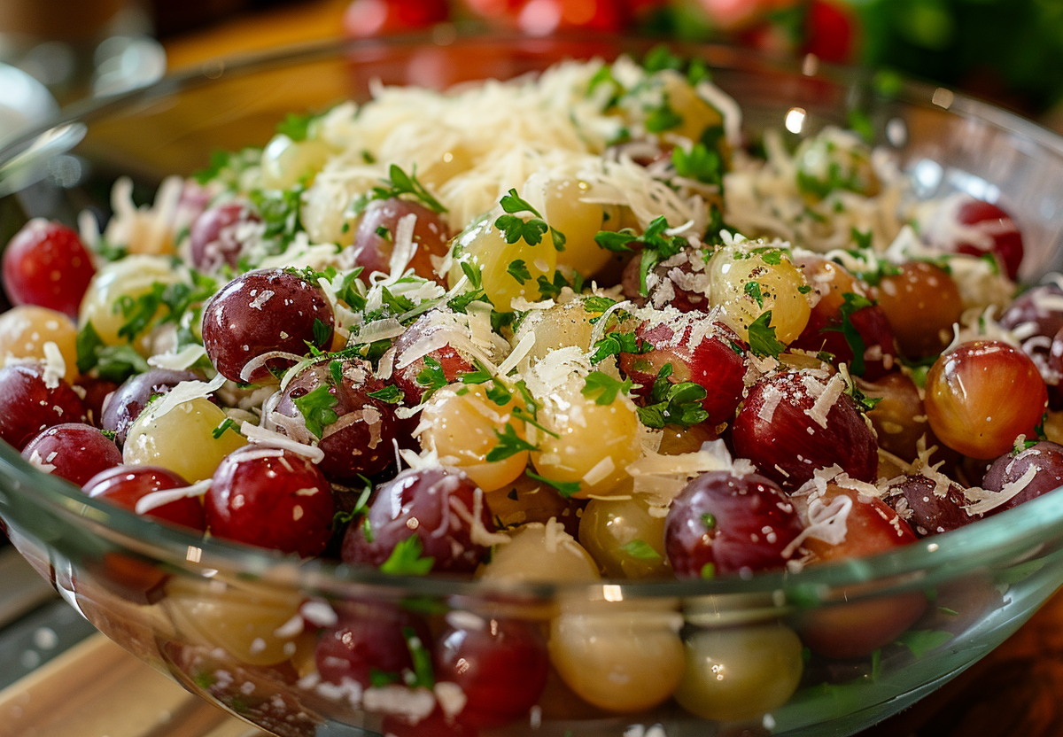 Для «Авангарда» беру 300 г кисло-сладкого винограда, 200 г сыра, 3 зубчика чеснока и немного майонеза. Виноград промываю и разрезаю пополам, при желании удаляю косточки. Сыр и чеснок натираю на мелкой терке, затем соединяю все в глубокой миске. Добавляю щепотку соли, черный перец и зелень, перемешиваю и слегка заправляю майонезом. За счет сочетания сладкого винограда, соленого сыра и легкой чесночной остроты салат получается удивительно гармоничным и очень сочным. Он прекрасно подходит к игристому и мгновенно исчезает со стола.