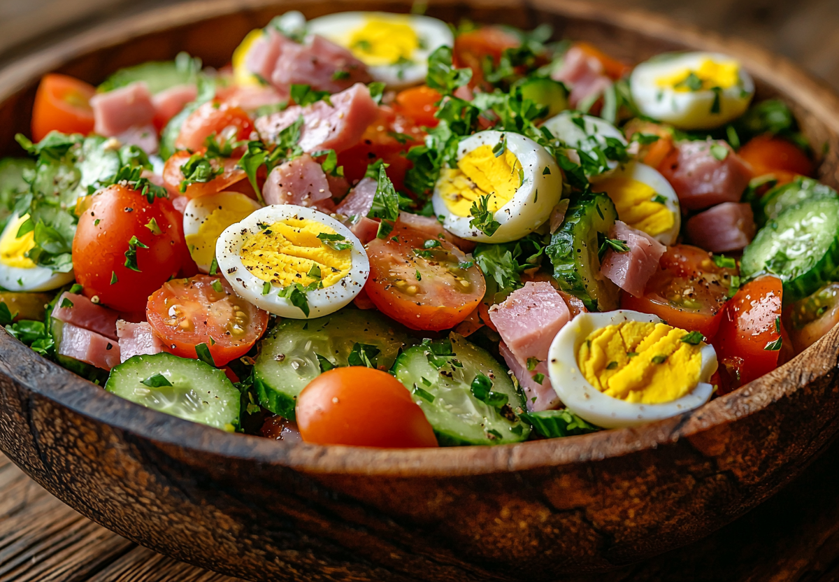 В основе салата самые привычные продукты — копченый окорок, свежие овощи и яйцо. Но в этом простом наборе кроется настоящая гармония вкусов.