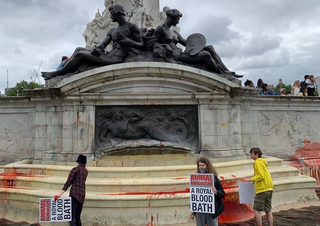 В Лондоне прошла акция протеста активистов движения Animal Rebellion. Они облили краской фонтаны Букингемского дворца, сообщает The Independent.