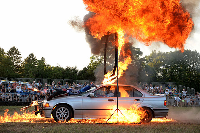 Каскадёр провалил трюк с прыжком с крыши автомобиля через горящие кольца. Инцидент случился в ходе экстремального шоу в Свердловской области.