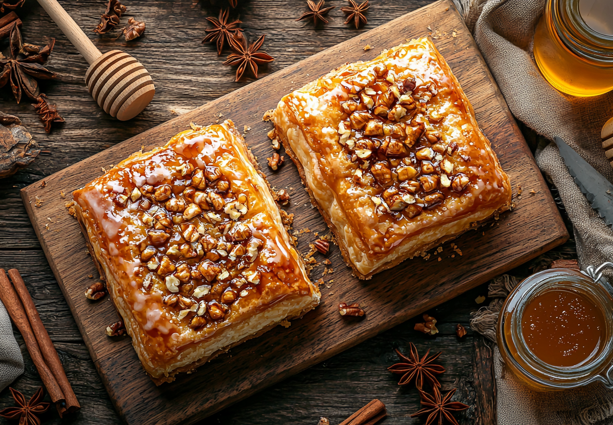 - Раскатайте два пласта, промажьте сгущёнкой с орехами, сложите.
