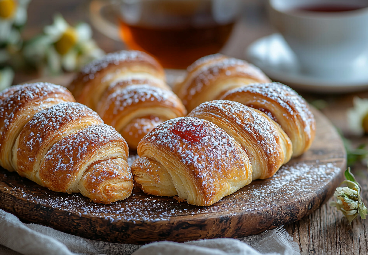 - На широкий край каждого треугольника выложите немного повидла и аккуратно сверните рулетиком от края к центру. Выпекайте рогалики на противне в разогретой до 180 °C духовке 20–25 минут до золотистого цвета. Горячие рогалики посыпьте сахарной пудрой.