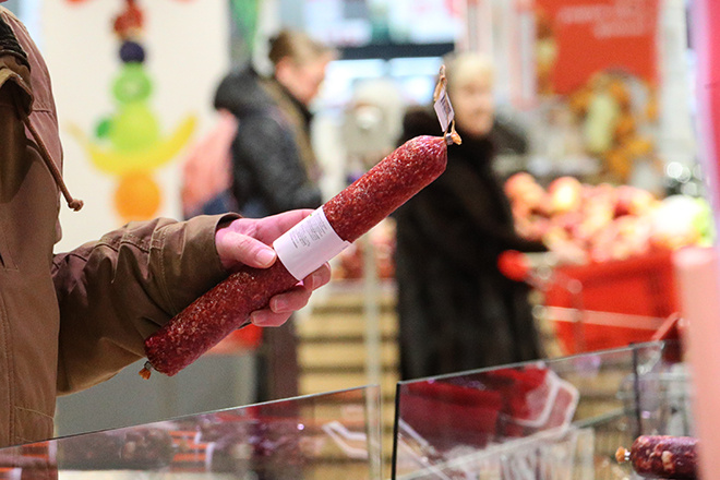 Российскому лидеру продемонстрировали несколько десятков сортов различной продукции, которая производится в этом регионе. Во время осмотра одной из точек Устинов взял колбасу.
