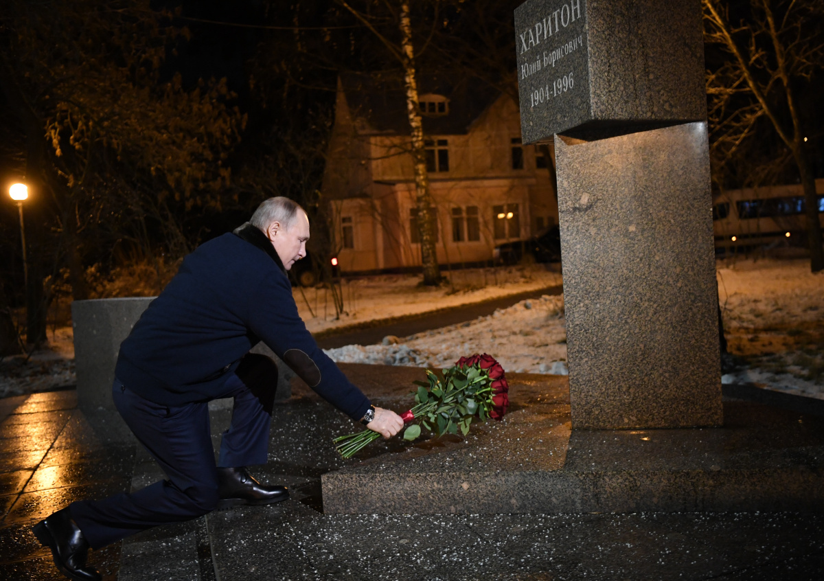 Президент РФ Владимир Путин в рамках рабочего визита в Саров возложил цветы к памятнику советскому учёному, главному конструктору первой советской атомной бомбы академику Юлию Харитону.
