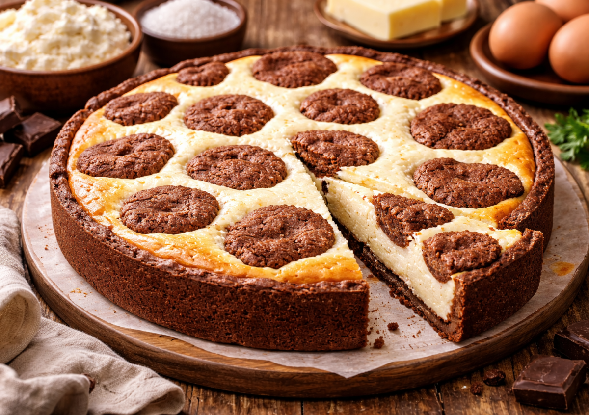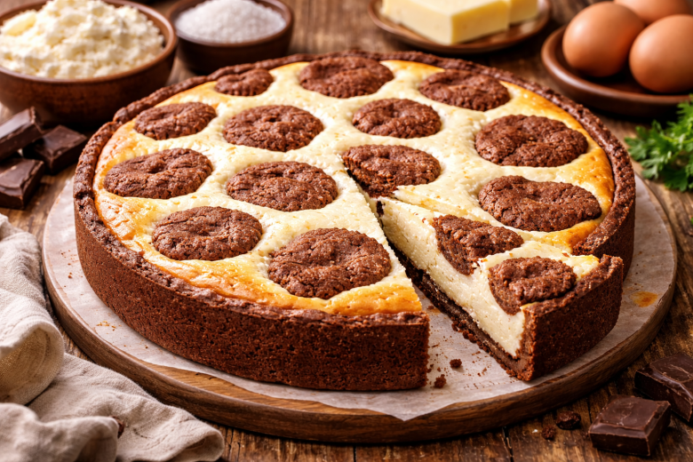 Мягкое сливочное масло растираем с сахаром, добавляем яйцо, муку, какао и разрыхлитель. Замешиваем мягкое шоколадное тесто. Небольшой кусочек откладываем для «пятнышек». Остальное тесто руками распределяем по дну и бортикам формы. Для начинки взбиваем творог с маслом, сахаром и ванилином до однородности, добавляем крахмал. По одному вводим яйца, каждый раз аккуратно перемешивая, — взбивать долго не нужно. Выливаем начинку на тесто. Из оставшегося теста формируем небольшие лепешки и хаотично выкладываем их сверху, создавая «коровий» рисунок. Выпекаем пирог при 170°C около 50 минут. После выпечки полностью остужаем при комнатной температуре — начинка станет плотной и нежной.
