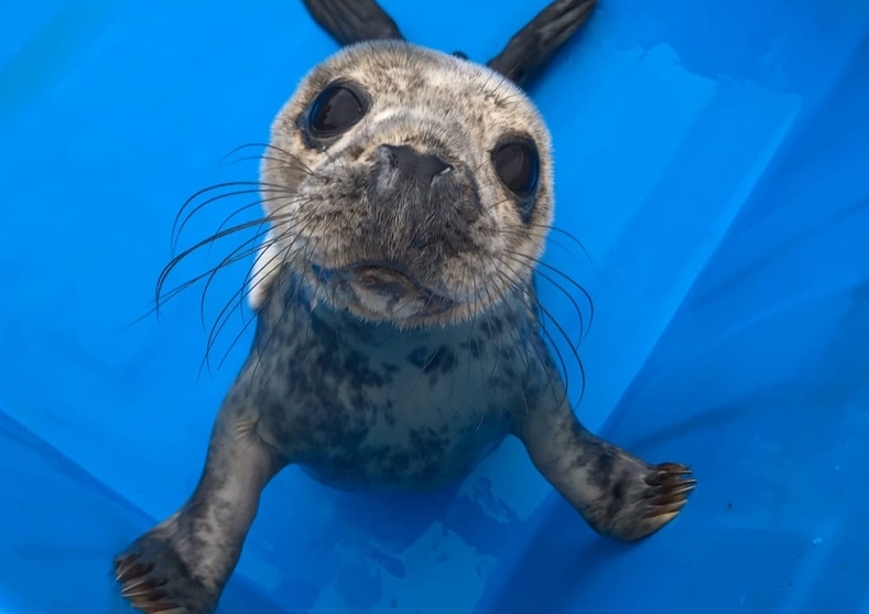 Самка тюленя попыталась сбежать из центра реабилитации в петербургском Репино, однако ей помешала закрытая дверь, и тогда она присела рядом.