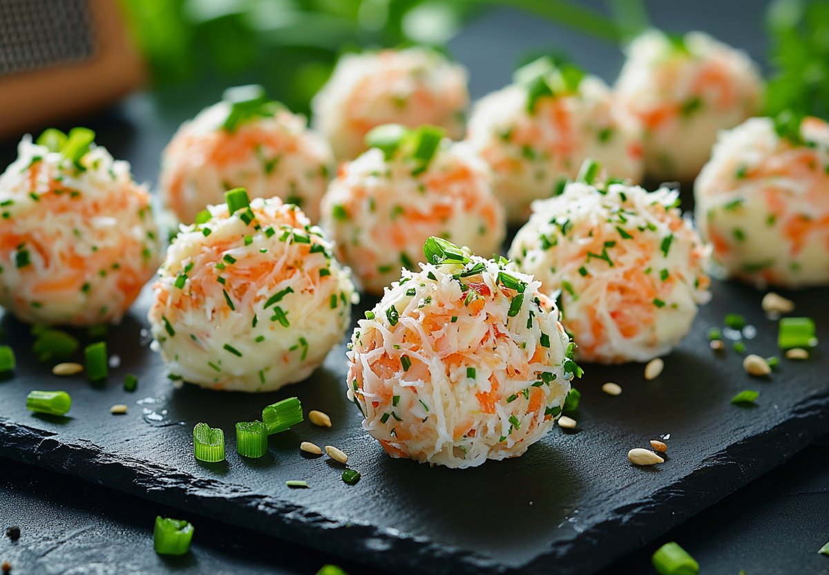 3. Лепим шарики. Мокрыми руками сформируйте небольшие шарики (как конфеты «Рафаэлло»). Если добавляете оливки — спрячьте кусочек внутрь каждого шарика. Обваляйте в тёртых крабовых палочках. Выложите на тарелку, украсьте зелёным луком. Охладите 20 минут в холодильнике — так они лучше держат форму.