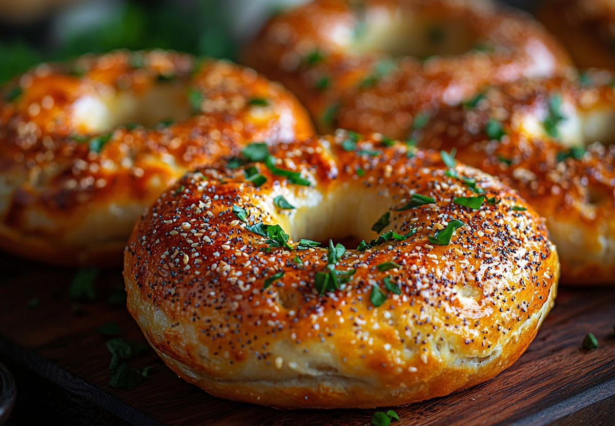 Противень застелите пергаментом, выложите на него заготовки, смажьте каждый бейгл желтком и посыпьте кунжутом. Поставьте выпекаться на 25 минут. Блюдо готово!