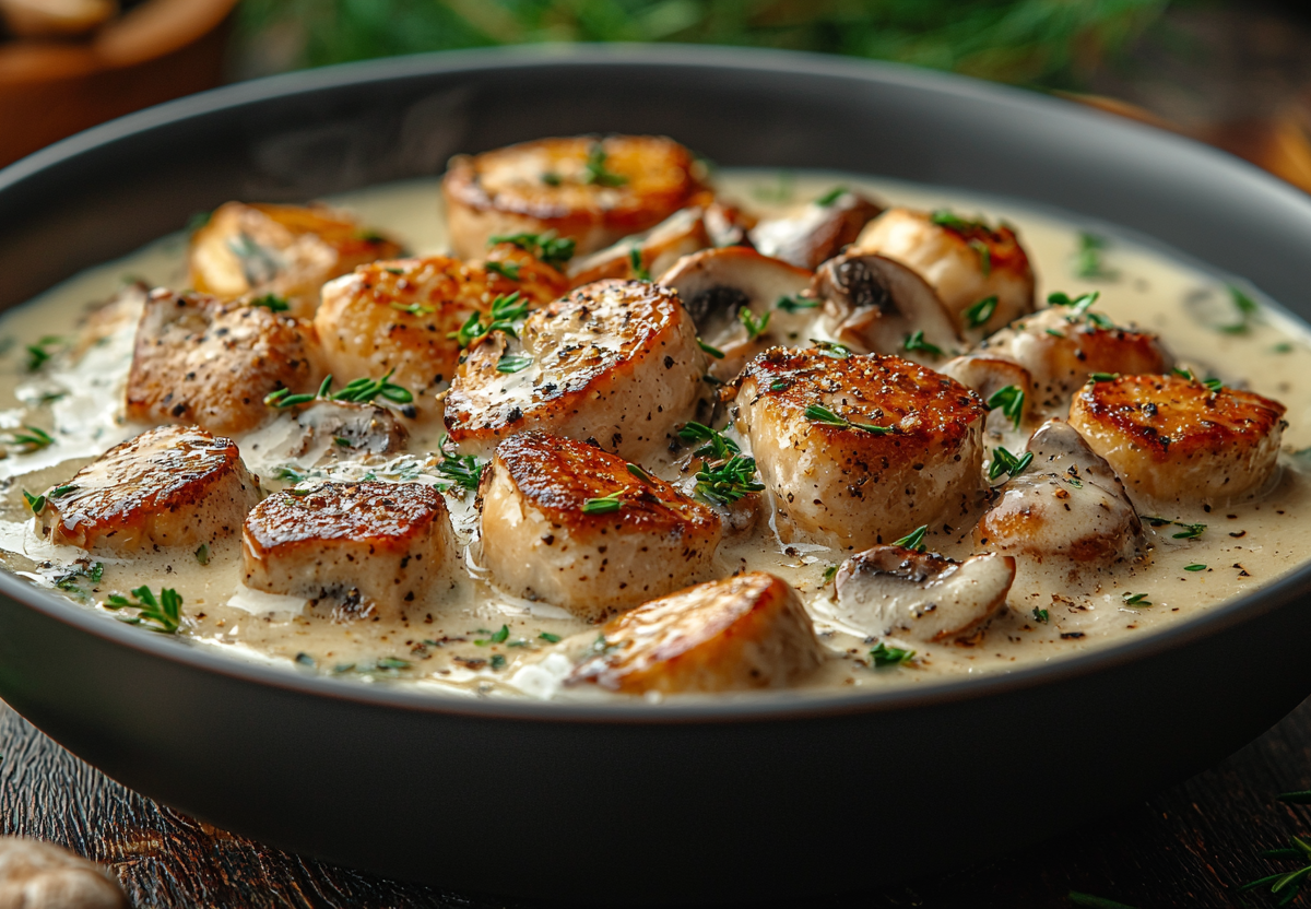 На три порции возьмите 450 г филе индейки, 200 г шампиньонов, луковицу, 250 мл сливок (22%), 20 г растительного масла, зелень, соль и сухие специи по вкусу.