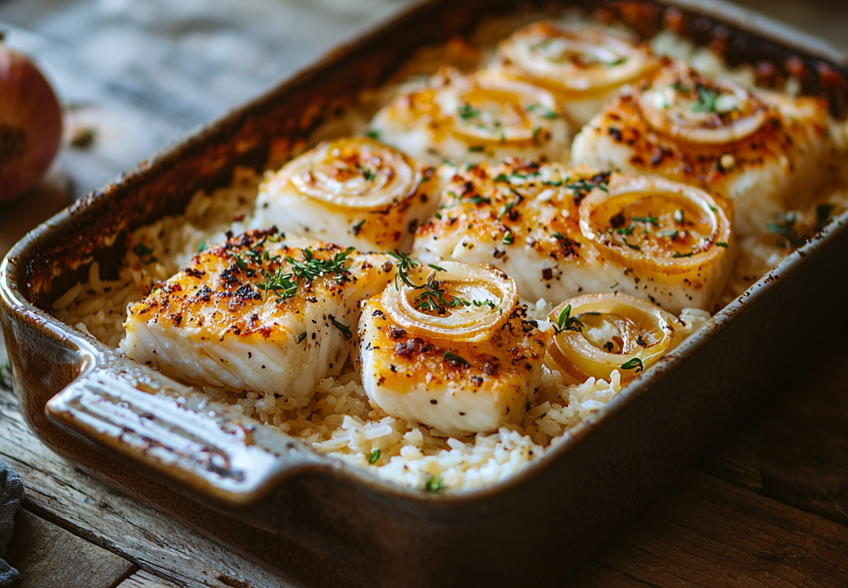 В форму для запекания выложите слой риса, затем слой лука, сверху распределите кусочки минтая.