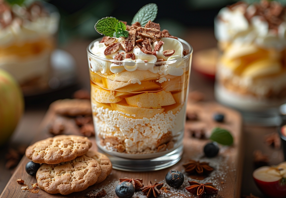 На дно стакана или пиалы выложите слой печенья, потом — слой ванильного творога, а сверху — порезанное яблоко. Блюдо готово! При подаче украсьте его листиком мяты.