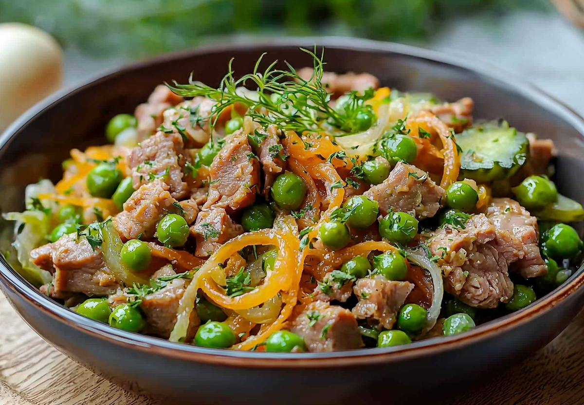 Возьмите 300 г отварной свинины, один соленый огурец, луковицу, два вареных яйца, три столовые ложки зеленого горошка, 50 г сыра, три салатных листа, 80 г майонеза, соль и перец по вкусу, по столовой ложке уксуса 9% и сахара, 100 мл воды.