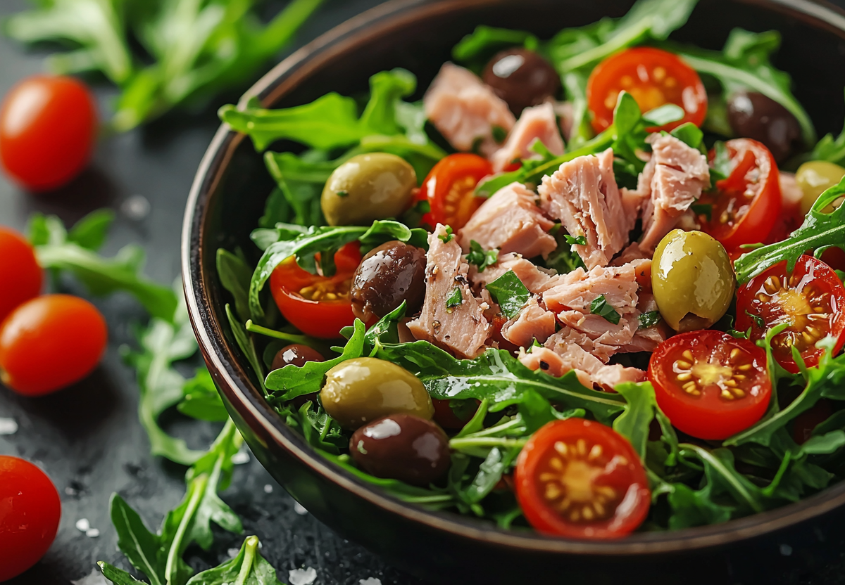 - В миске смешайте руколу, тунец, помидоры черри и маслины.