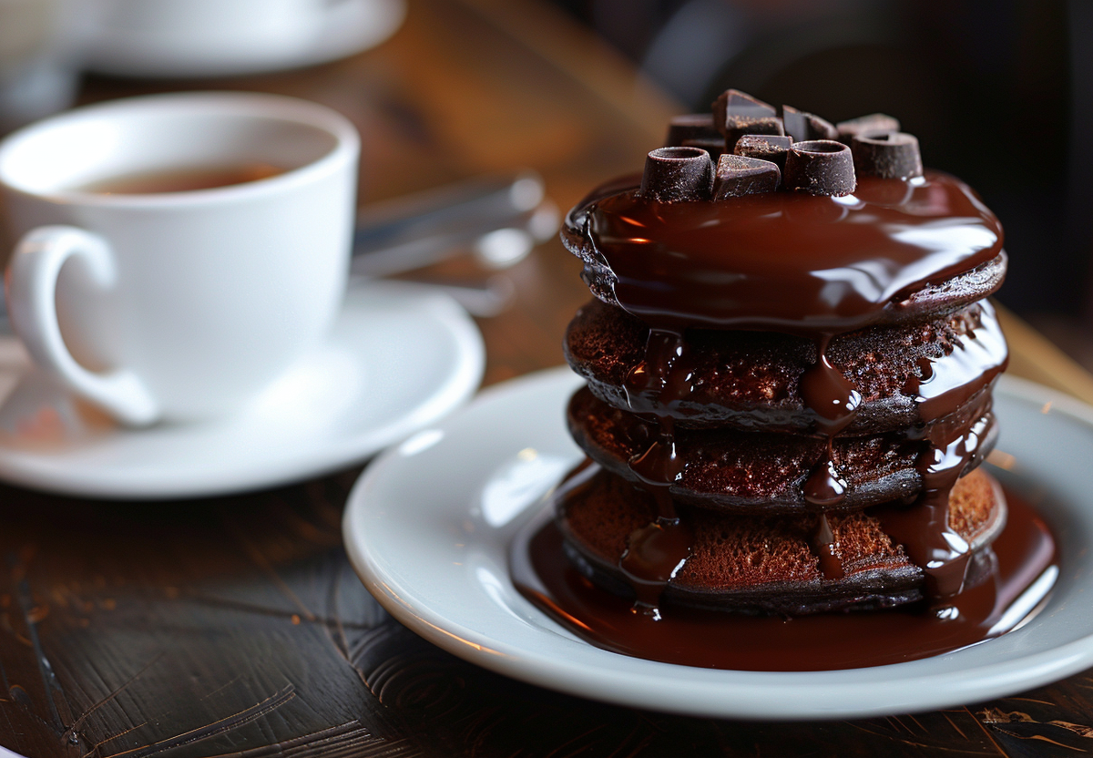 Вкусные шоколадные панкейки на завтрак. Они понравятся всей семье и станут отличным дополнением к основному блюду. При этом они не вредят фигуре — всего 179 ккал на 100 г.