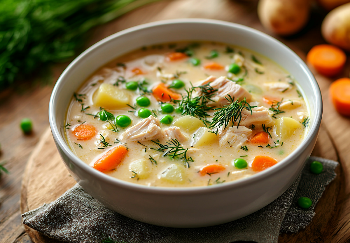 Сливочный суп с курицей и горошком — нежный, сытный и низкокалорийный. Идеальный вариант для тех, кто любит легкие, но питательные блюда. Нежный сливочный вкус, кусочки курицы и овощей — этот суп согреет в холодный день и станет отличным обедом для всей семьи. Всего 79,9 ккал на 100 граммов — вкусно и полезно!