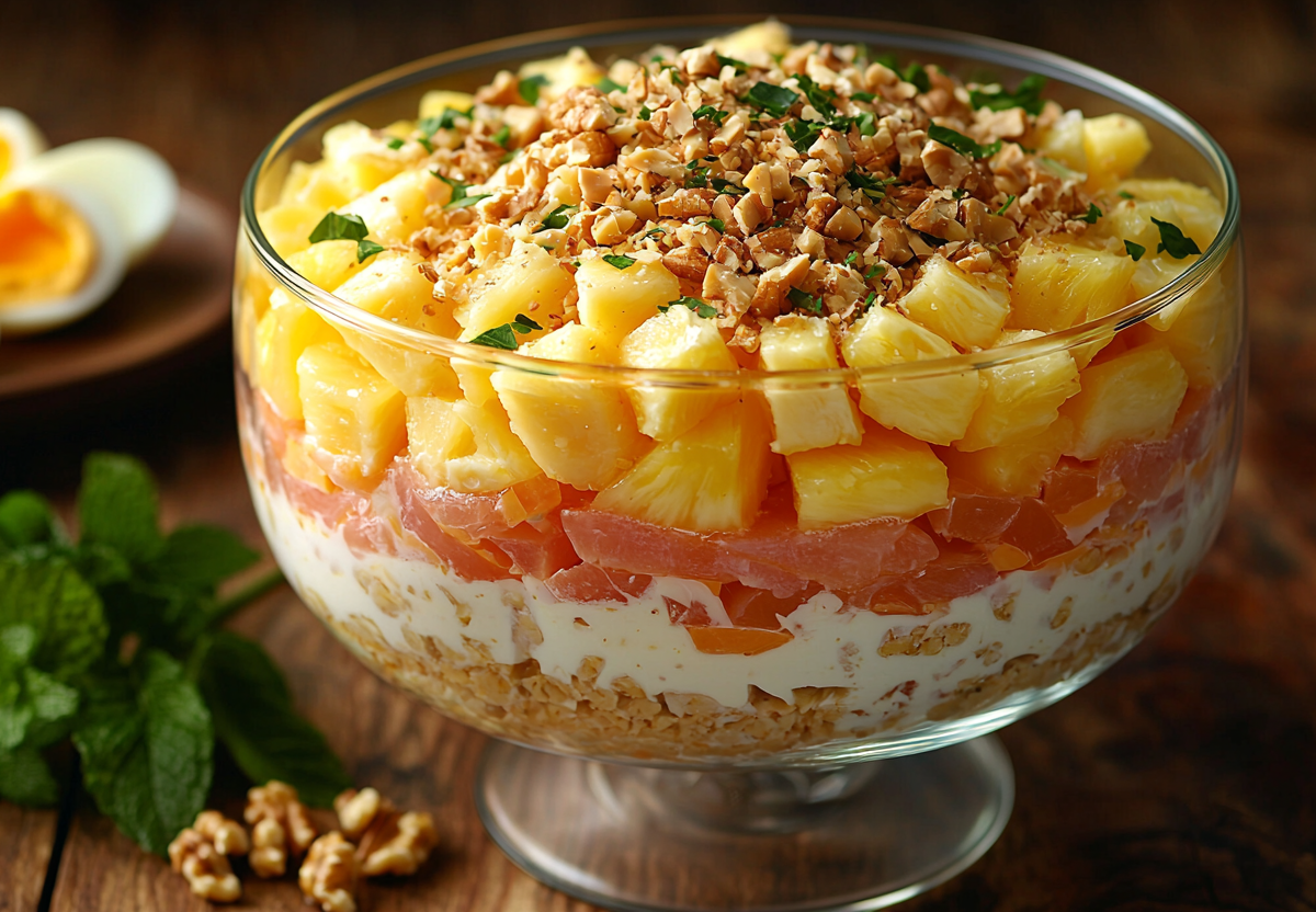 Рецепт для похудения! Слоеный салат «Тропический» с курицей и ананасом
